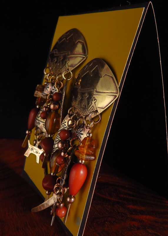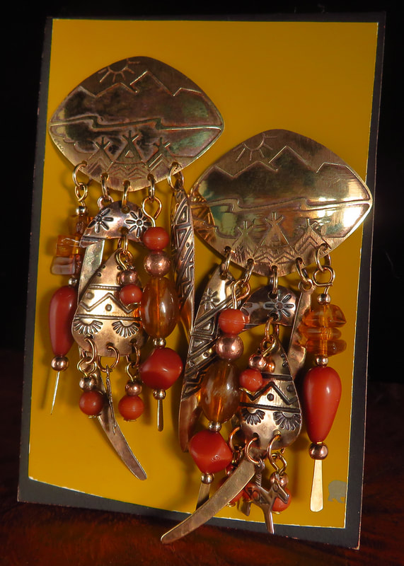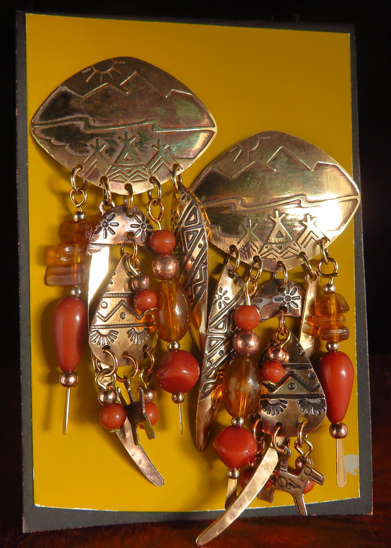 Embossed Southwest desert scene on brass or copper metal suspending carnelian and amber colored beads with various metal symbols